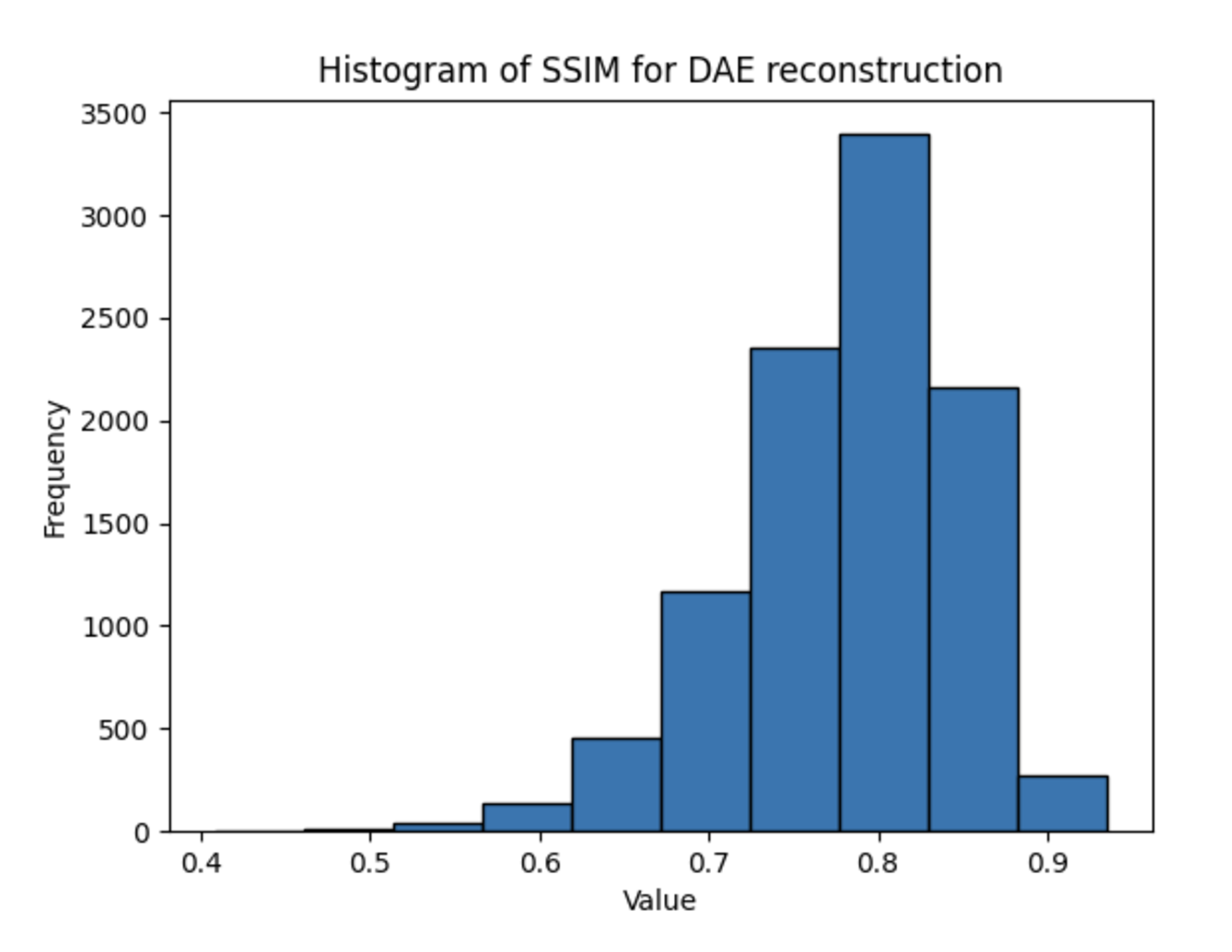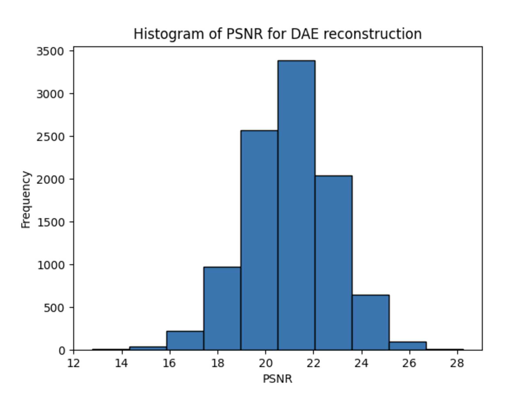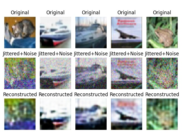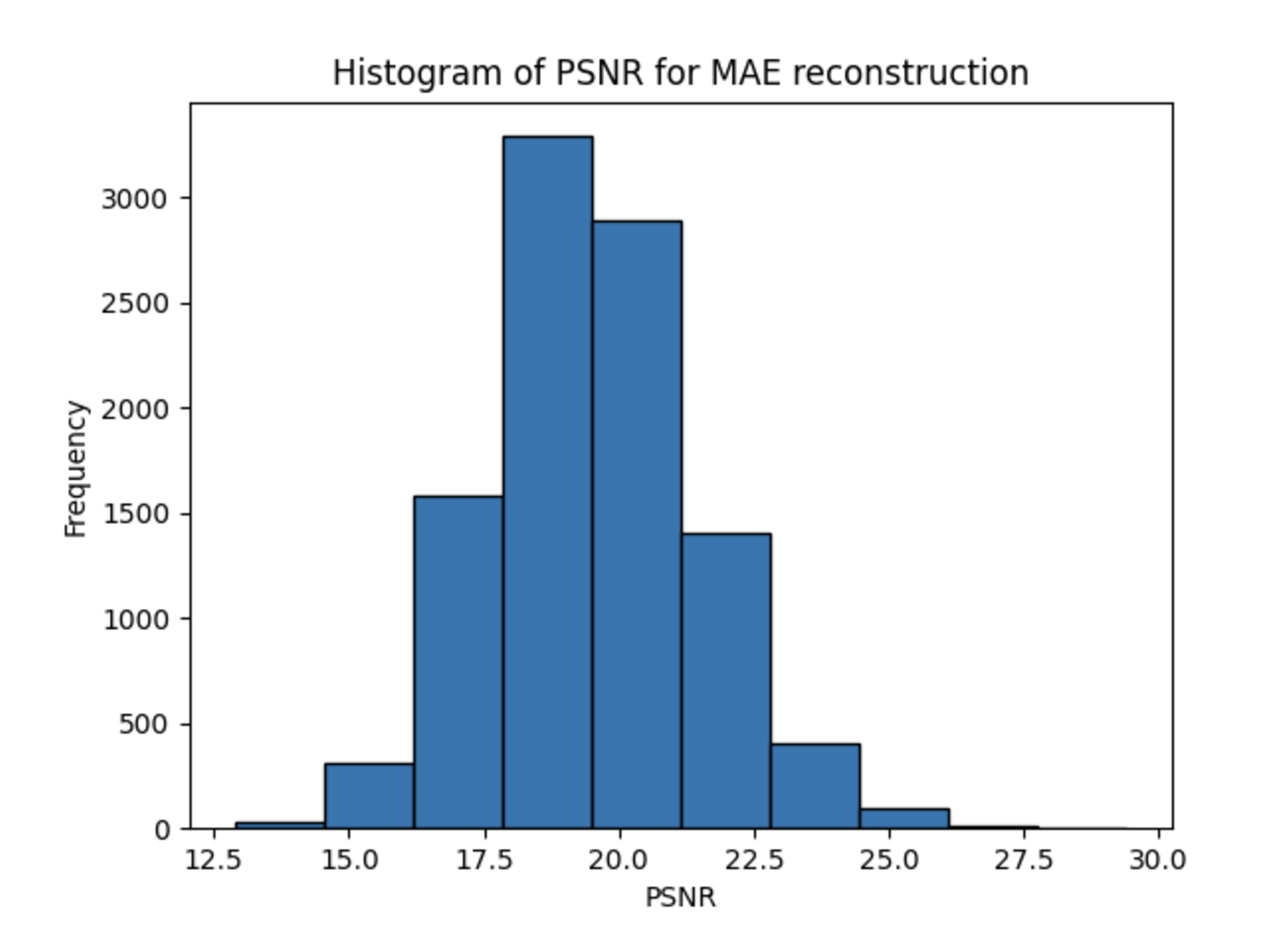 Across all experiments, contrary to our expectations due to the richer hidden representation of the MAE models, the DAE outperformed the MAE consistently in terms of PSNR and SSIM metrics, achieving higher values in both. A sample output calculation is shown below for the CIFAR-10 dataset.