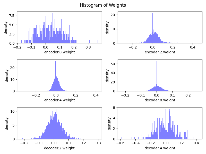 For each experiment, we plotted the weight distributions of each layer, ignoring normalization layers and the bias terms, of the DAE and the MAE models. An example of this distribution is shown below for the CIFAR-10 dataset.