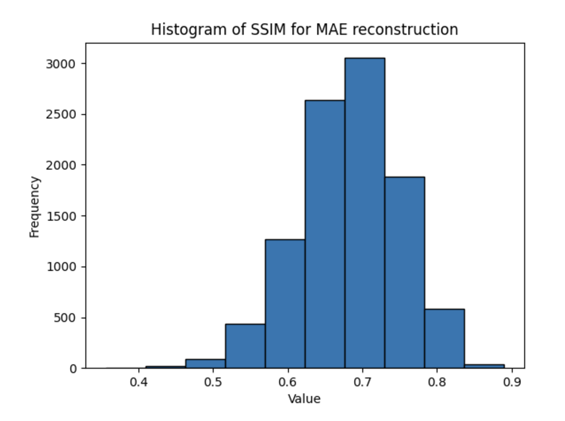 One reason for these discrepancies may be the fact that the architectures take inherently different inputs: the MAE’s masked input may be a harder input to reconstruct, even if the weights learned when creating a latent representation are more useful for downstream tasks. While this addresses the superiority of the DAE in terms of PSNR, which measure purely per-pixel reconstruction accuracy, it cannot fully explain the better performance of the DAE in terms of SSIM, the metric for structural information. One explanation for this could be the small patch sizes used for the MAE training — each patch consists of only 4 pixels, limiting the structural information present.