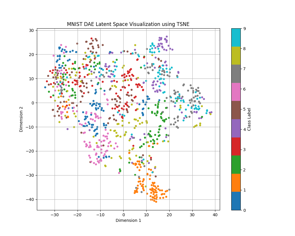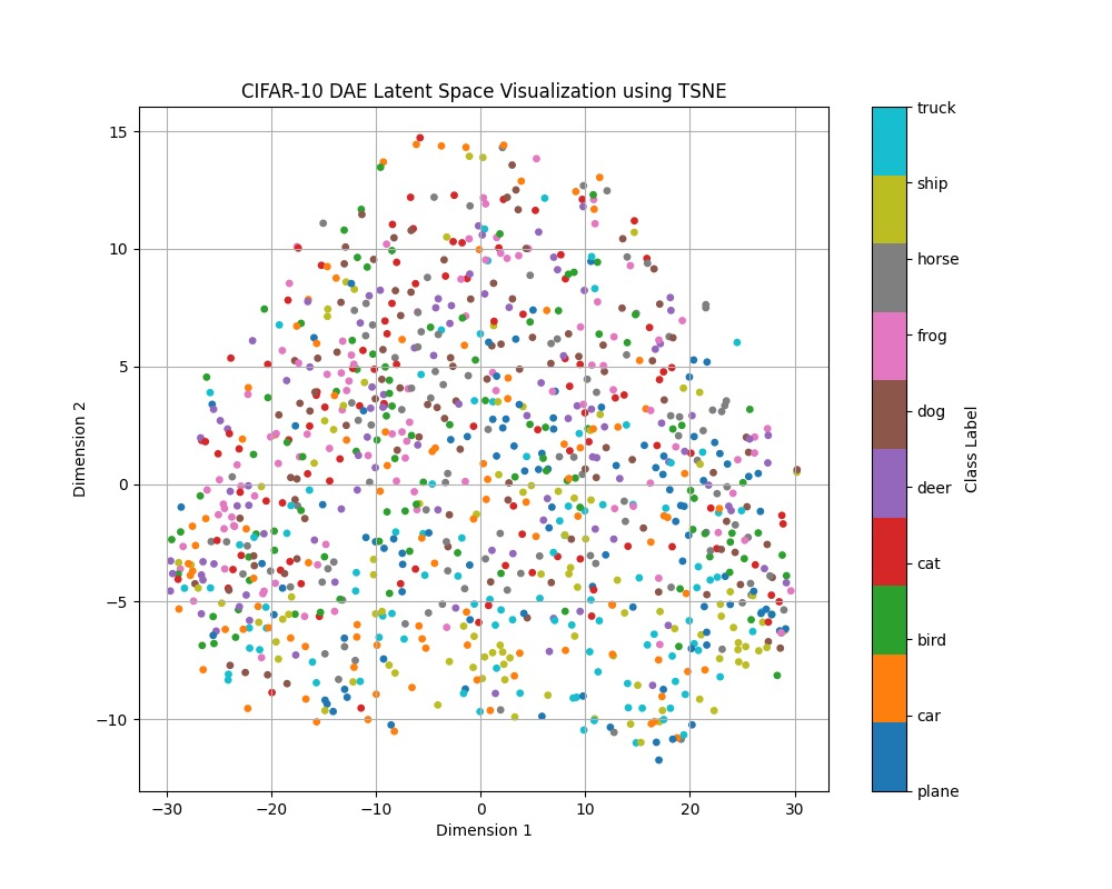 Our hypothesis for why the MAE performs better was that the latent space contained more information that helped to distinguish the image. In order to test this theory, we decided to visualize the latent space for both the DAE and the MAE, using t-SNE to reduce the latent space dimensionality and plotting out an equal number of samples from each class [12].