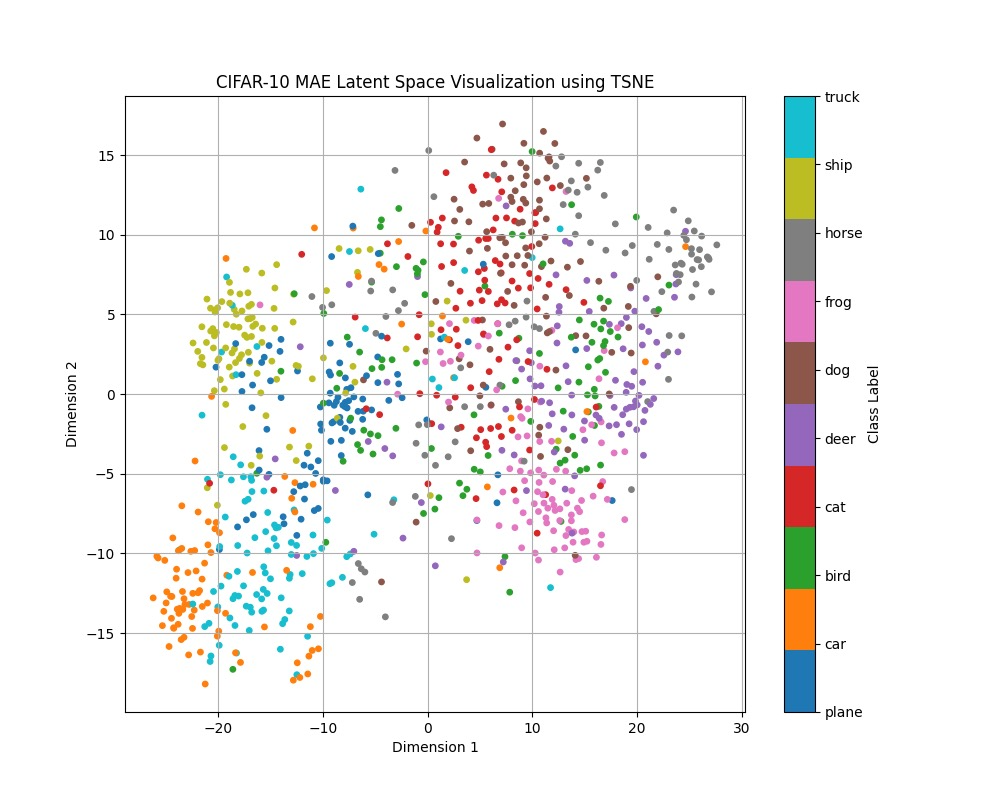 Our group hypothesized that ViT-based MAEs may produce a more meaningful latent space compared to simpler, purely convolutional DAEs. Specifically, if we observe well-defined clusters in the latent space representations of inputs from the same image class, we can conclude that the MAE's latent space captures more semantic information about the actual input image.