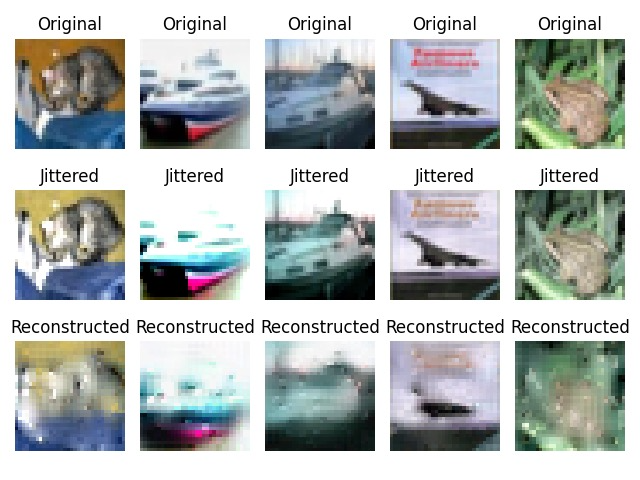 The results provide valuable insights into the MAE's ability to outperform DAEs on high-level image classification tasks while shedding light on the underlying factors that enable its performance. The MAE demonstrated resilience to color-jittering, maintaining high classification accuracy and well-defined latent space clustering, even under input distortions. This robustness highlights the model's ability to capture meaningful semantic features, which are crucial for classification tasks. However, the lower PSNR and SSIM scores observed for the MAE reflect its trade-off in reconstruction quality, likely due to the limited information available in the masked inputs and the use of small patch sizes (2x2).