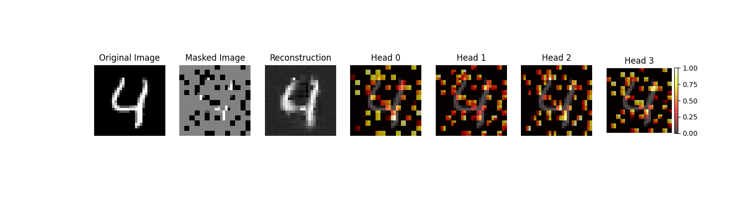 For the MAEs, we generate attention maps that indicate which patches the ViT encoder focused the most on during the forward pass. This is done by taking the attention weights from the ViT's last layer and multiplying these values against the patched masked image, creating one map per attention head. The resulting heatmaps are normalized to the [0, 1] range and displayed, following the same pattern where brighter colors indicate higher attention. An example for both the saliency and attention maps for the MNIST dataset is shown below.