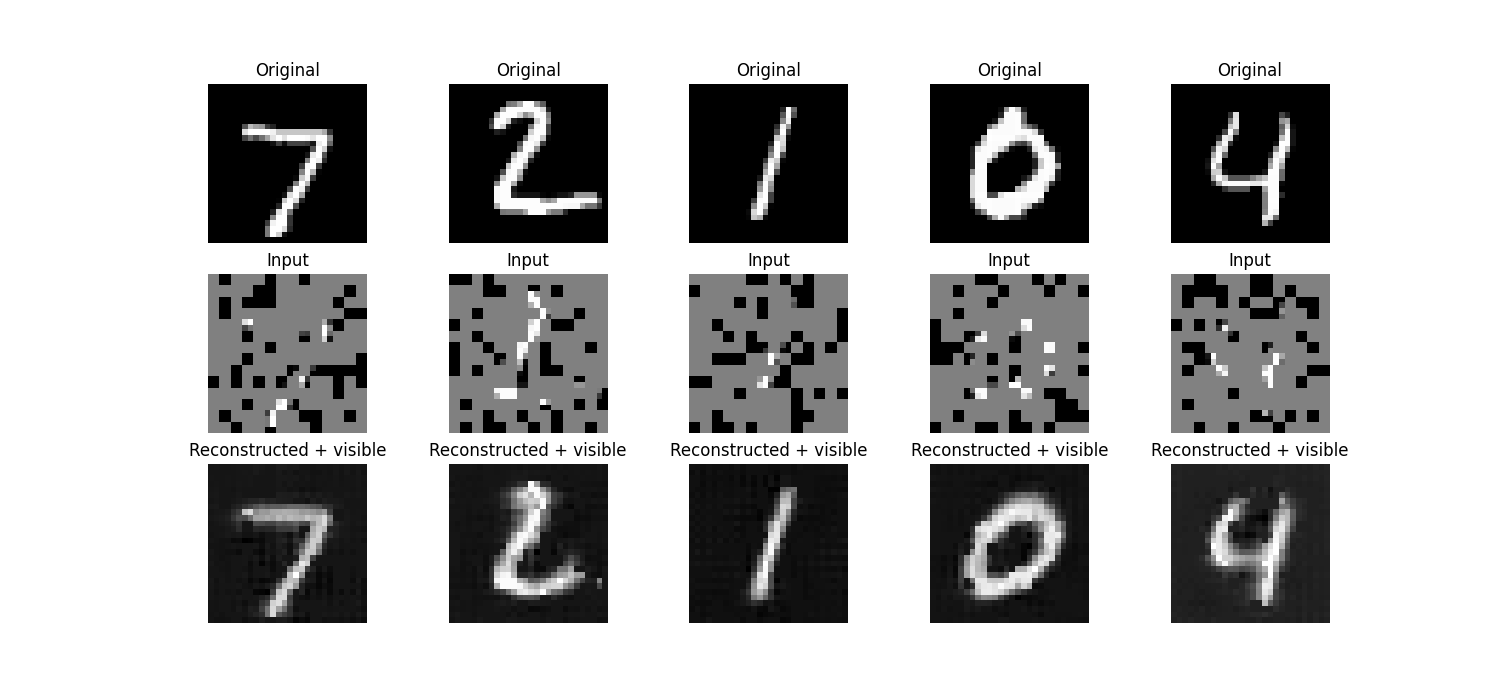 In addition to the classification accuracies, we provide visualizations of the original, input, and reconstructed images for both the DAE and MAE below for human quality assessment.